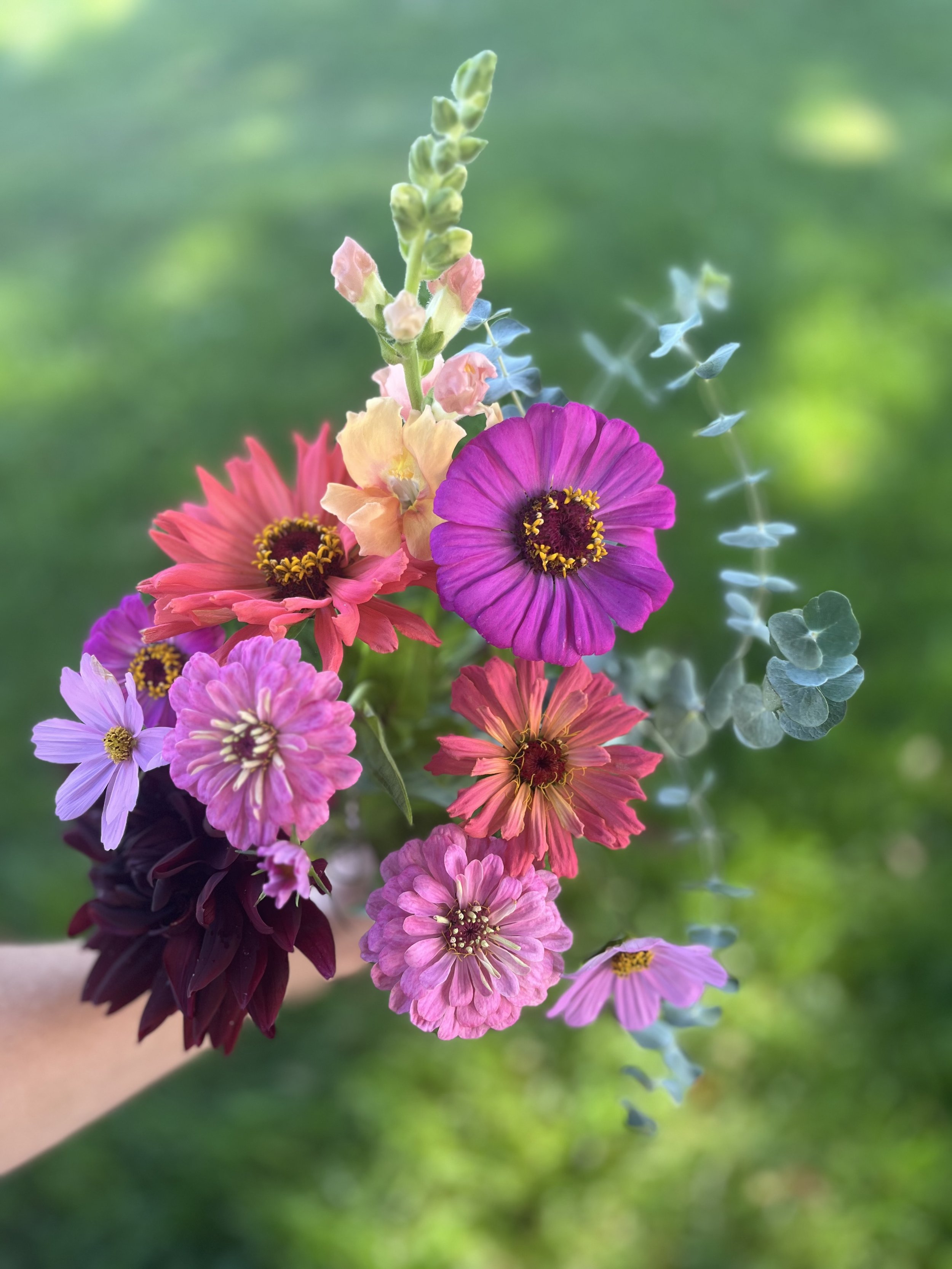 At Backyard Blooms, we believe in sustainability, community connection, and making everyday moments a little more beautiful. Whether you're picking up a cheerful bunch for your kitchen table or a thoughtful gift for someone special, we offer a rotating selection of unique, farm-fresh arrangements -- all grown with love right here in our neighborhood.